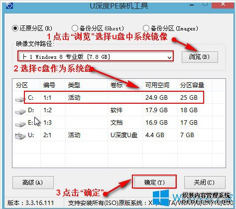 3、进入PE后会自启U深度PE装机工具,首先点击“浏览”将保存在U盘的系统镜像添加进来,接着选择C盘作系统盘存放镜像,点击“确定”。