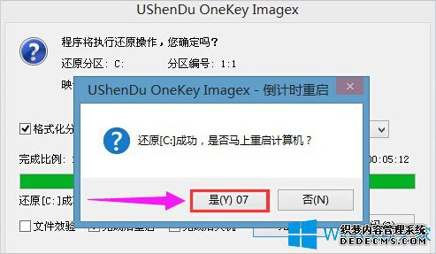 6、释放完成后所出现的提示重启窗口中可点击确定或者等待10秒让电脑重新启动。