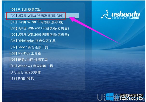 2、先将U深度U盘启动盘连接到电脑,重启电脑等待出现开机画面时按下启动快捷键,使用U盘启动盘进入U深度主菜单,选择【02】U深度Win8PE标准版(新机器),按下回车键进入。